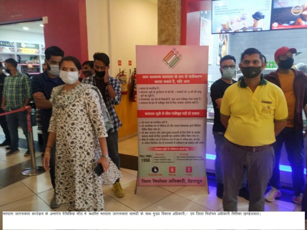 देहरादून। कोविड वैक्सीनेशन मेला के साथ जिला प्रशासन द्वारा मतदाता जागरूकता कार्यक्रम के अन्तर्गत पैसिफिक माॅल में मतदाता के रूप में पंजीकरण करवाने की जानकारी स्थापित करते हुए जागरूकता अभियान चलाया गया। उक्त के क्रम में उप जिला निर्वाचन अधिकारी/मुख्य विकास अधिकारी नितिका खण्डेलवाल ने अवगत कराया कि जनपद मे निरन्तर मतदाता जागरूकता कार्यक्रम चलाया जा रहा है।