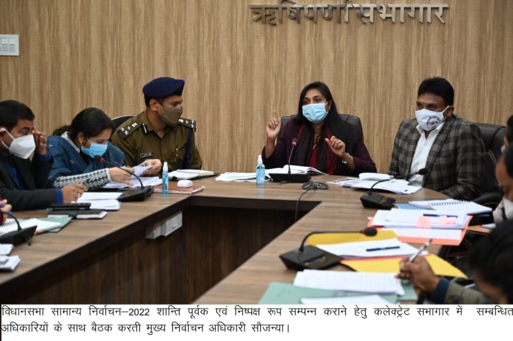 देहरादून । विधानसभा सामान्य निर्वाचन-2022 शान्ति पूर्वक एवं निष्पक्ष रूप सम्पन्न कराने हेतु मुख्य निर्वाचन अधिकारी सौजन्या ने ऋषिपर्णा सभागार कलैक्टेªट सभागार में जिला निर्वाचन अधिकारी/जिला मजिस्टेªट डाॅ0 आर राजेश कुमार एवं डीआईजी/ वरिष्ठ पुलिस अधीक्षक जन्मजेय खण्डूरी सहित समस्त रिटर्निंग अधिकारी एवं निर्वाचन कार्य में लगे समस्त नोडल अधिकारियों के साथ जनपद में निर्वाचन कार्यों को लेकर बैठक ली। उन्होंने समस्त अधिकारियों का निर्देशित करते हुए कहा कि इस बार के निर्वाचन कार्य गत निर्वाचन की अपेक्षा भिन्न है। उन्होंने कहा कि कोविड संक्रमण के दृष्टिगत शान्तिपूर्वक निर्वाचन सम्पन्न कराना अपने-आप में एक चुनौती है इसके लिए सभी रिटर्निंग अधिकारियों एवं नोडल अधिकारियों को इसमें विशेष ध्यान रखते हुए बिना किसी विवाद में पड़े अपने दायित्वों का कुशलता पूर्वक निर्वहन करना है।