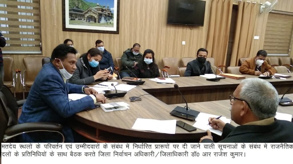 देहरादून । जिला निर्वाचन अधिकारी/जिलाधिकारी डाॅ0 आर राजेश कुमार की अध्यक्षता में ऋषिपर्णा सभागार कलेक्ट्रेट में मतदेय स्थलों के परिवर्तन एवं सहायक मतदेय स्थल के संबंध में राजनैतिक दलों के प्रतिनिधियों के साथ बैठक हुई। जिला निर्वाचन अधिकारी/जिलाधिकारी ने कहा कि कोरोना की तीसरी लहर की आंशाकाओं के दृष्टिगत कोविड संक्रमण व ओमिक्रोन संक्रमण को दृष्टिगत रखते हुए भारत निर्वाचन आयोग द्वारा मतदाताओं की अधिकतम संख्या 1500 के स्थान पर 1250 की गई है।