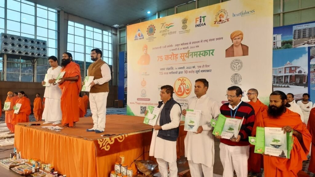 हरिद्वार, । आयुष मंत्रालय एवं पतंजलि योगपीठ के संयुक्त प्रयास से मकर संक्रांति एवं आजादी के अमृत महोत्सव पर्व के उपलक्ष्य में 1 करोड़ से अधिक लोगों ने सूर्य नमस्कार किया। उल्लेखनीय है कि आयुष मंत्रालय भारत सरकार ने अमृत महोत्सव के अन्तर्गत अनेक मंत्रालयों के सहयोग व प्रमुख राष्ट्रीय स्तर के योग संस्थानों विशेषतः पतंजलि योगपीठ, क्रीड़ा भारती नेशनल योगासन स्पोर्ट्स फेडरेशन, गीता परिवार एवं हार्टफुलनेस संस्थान के लाखों योग साधकों ने 75 लाख से अधिक लोगों का पंजीकरण किया एवं उन्हें सूर्य-नमस्कार करने के लिए प्रेरित किया। जिन्होंने प्रातः 7 बजे से इस कार्यक्रम में ऑनलाइन भागीदारी करते हुए 1 करोड़ से अधिक प्रतिभागियों ने 13 बार सूर्य-नमस्कार करके एक ही दिन में 10 करोड़ से अधिक सूर्य नमस्कार के अभ्यास करने का विश्व कीर्तिमान बनाया।