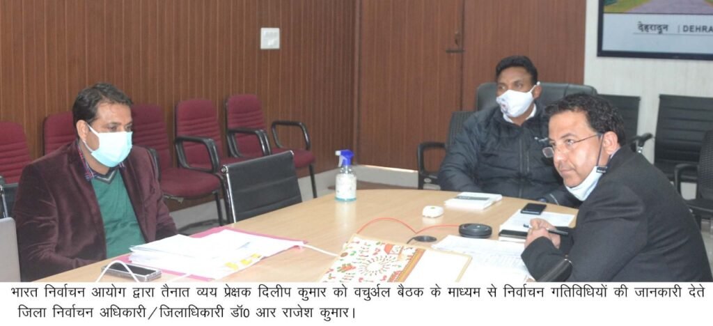 देहरादून । भारत निर्वाचन आयोग द्वारा विधानसभा सामान्य निर्वाचन-2022 के सफल सम्पादन हेतु जनपद देहरादून के लिए तैनात व्यय प्रेक्षक नवनीत मनोहर व दिलीप कुमार द्वारा वर्चुअल माध्यम से व्यय अनुवीक्षण से संबंधित नोडल अधिकारियों के साथ प्रारम्भिक तैयारियों की समीक्षा की। वर्चुअल बैठक में जिलाधिकारी/जिला निर्वाचन अधिकारी डाॅ0 आर राजेश कुमार व वरिष्ठ पुलिस अधीक्षक/डीआईजी जन्मजेय खण्डूरी भी उपस्थित रहे।
