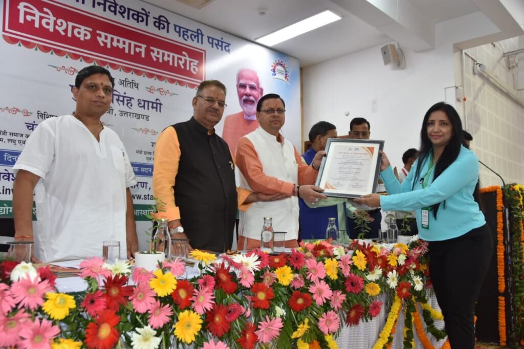 देहरादून। मुख्यमंत्री पुष्कर सिंह धामी ने मुख्यमंत्री आवास स्थित मुख्य सेवक सदन में आयोजित उत्तराखण्ड निवेशक सम्मान समारोह के दौरान निवेशकों को प्रतीक चिन्ह तथा प्रशस्ति पत्र से सम्मानित किया गया।