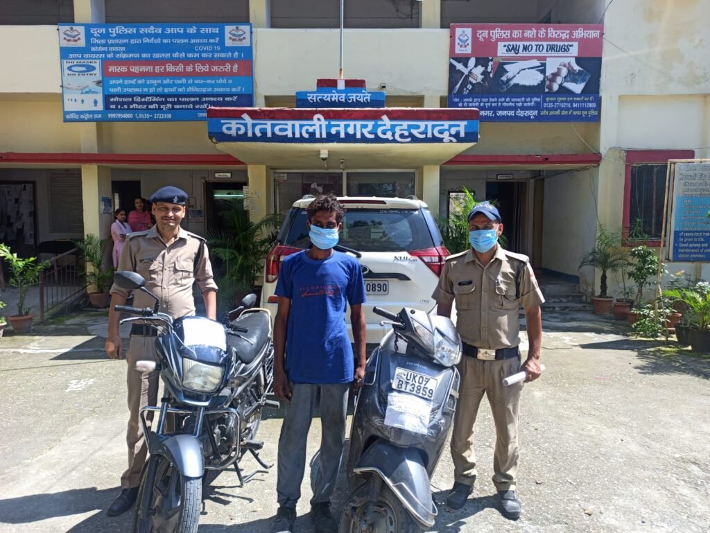 अभियोग के सफल अनावरण हेतु पुलिस वरिष्ठ पुलिस अधीक्षक जनपद देहरादून के निर्देशन में पुलिस अधीक्षक नगर एवं क्षेत्राधिकारी नगर के निकट पर्यवेक्षण में प्रभारी निरीक्षक कोतवाली, नगर के द्वारा उचित दिशा निर्देश देते हुए अज्ञात वाहन चोर अभियुक्त की गिरफ्तारी हेतु टीम गठित की गई जिसके क्रम में कोतवाली नगर पुलिस टीम द्वारा आज दि0 19/9/22 की शाम दौराने चेकिंग रेलवे स्टेशन के निकट मद्रासी कॉलोनी वाले मार्ग से अभियुक्त अनुज ठाकुर पुत्र श्री राजन सिंह निवासी कारगी ग्रांट, चंद्रबदनी देहात, थाना पटेलनगर, देहरादून उम्र 26 वर्ष को चोरी की गई विभिन्न उपरोक्त दोनों मुकदमों से सम्बन्धित 01 अदद मोटर साईकिल एवं एक अदद स्कूटी के साथ गिरफ्तार किया गया। एक मोटर साईकिल दौरान चेकिंग अभियुक्त से मौके पर बरामद एवं शेष 01 चोरी की स्कूटी अभि0 गण की निशानदेही पर रेलवे स्टेशन के सामने स्थित रिजर्वेशन काउंटर के पीछे से कोतवाली नगर से चोरी हुई बरामद की गई।