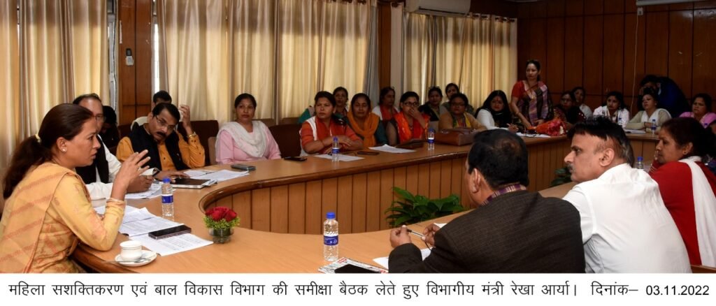 देहरादून। प्रदेश की महिला सशक्तिकरण एवं बाल विकास मंत्री रेखा आर्या द्वारा महिला एवं बाल विभाग के अंतर्गत महालक्ष्मी योजना, आंगनबाड़ी कार्यकत्रियों के मानदेय वृद्धि इत्यादि के संबंध में विभागीय अधिकारियों के साथ समीक्षा बैठक की गई।