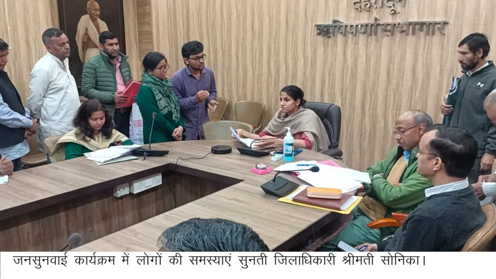 देहरादून । जिलाधिकारी श्रीमती सोनिका की अध्यक्षता में ऋषिपर्णा सभागार कलेक्टेªट में जनसुनवाई का आयोजन किया गया। जनसुनवाई में 104 शिकायतें आई जिनमें आपसी विवाद, परिवार विवाद, विद्युत कनेक्शन लगवाने, पढाई हेतु आर्थिक सहायता दिलाने, समाज कल्याण विभाग की पेशन लगवाने, एनएच रोड़ पर पुस्ता निर्माण करवाने, पेयजल कनेक्शन का बीजक माफ कराने सहित भूमि संबंधी कुछ शिकायतें प्राप्त हुई, जिनमें अधिकतर शिकायतों का मौके पर निस्तारण किया गया।