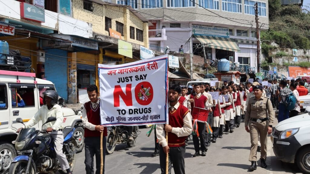 पौड़ी। भारत सरकार के आदेशों के क्रम में 26 जून 2023 को “मादक पदार्थों के दुरुपयोग व अवैध तस्करी के खिलाफ अन्तर्राष्ट्रीय ड्रग्स दिवस” के अवसर पर उत्तराखण्ड राज्य में “नशा मुक्त भारत अभियान” के अन्तर्गत” दिनाँक 12.06.2023 से 26.06.2023 तक “नशा मुक्त भारत पखवाड़ा” के रुप में एक बृहद जनजागरुकता कार्यक्रम आयोजन के क्रम में वरिष्ठ पुलिस अधीक्षक पौड़ी श्रीमती श्वेता चौबे के निर्देशन में पुलिस कार्यालय पौड़ी से पुलिस एवं स्कूली छात्र-छात्राओं की नशे के विरूद्ध जागरूकता रैली निकाली गई। जिसको हरी झण्डी दिखाकर वरिष्ठ पुलिस अधीक्षक महोदया द्वारा रवाना किया गया।