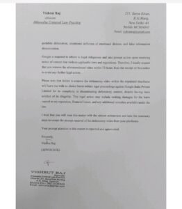 यह कानूनी नोटिस उन विशिष्ट चिंताओं और कानूनी कार्रवाइयों को रेखांकित करता है जो मेरे ग्राहक उपरोक्त मानहानिकारक वीडियो के आलोक में उठाना चाहते हैं। हम आपसे इस मामले पर शीघ्र ध्यान देने का अनुरोध करते हैं और आपसे संलग्न कानूनी नोटिस की गहन समीक्षा करने का आग्रह करते हैं।
