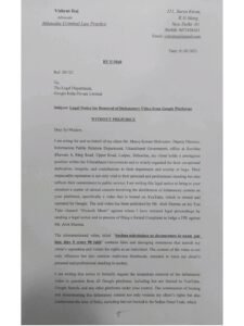 मैं आपको अपने ग्राहक, उत्तराखंड सरकार के सूचना जनसंपर्क विभाग के उप निदेशक, श्री मनोज कुमार श्रीवास्तव की ओर से लिख रहा हूं। इस पत्र के साथ संलग्न, आपको आपके प्रतिष्ठित संगठन को संबोधित एक कानूनी नोटिस मिलेगा, संदर्भ: 301/23, यूट्यूब पर होस्ट किए गए एक अपमानजनक वीडियो को हटाने से संबंधित, जो Google के स्वामित्व वाला एक मंच है, और श्री आलोक शर्मा द्वारा प्रकाशित किया गया है। चैनल “श्रमिक मंत्र।”