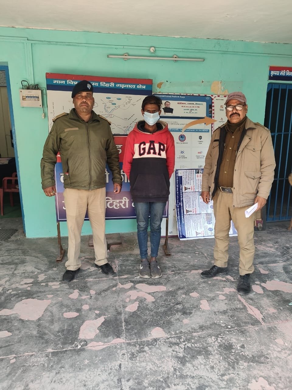 टिहरी। जनपद आज दिनाँक 16.02.2024 को वरिष्ठ पुलिस अधीक्षक, जनपद टिहरी गढ़वाल के आदेशानुसार व अपर पुलिस अधीक्षक महोदय, टिहरी गढ़वाल के निर्देशन में तथा क्षेत्राधिकारी, नरेंद्रनगर के पर्यवेक्षण में कोतवाली कीर्तिनगर क्षेत्र में मफरुर/ ईनामी (1500/-रु० ईनाम घोषित) चल रहे सम्बन्धित फौ0वा0सं0- 03/2020 मु0अ0सं0- 21/2019 धारा 379/511/427 भा0द0वि0 से सम्बन्धित मफरुर/वारण्टी/ईनामी पंकज लाल उर्फ पंकज पंवार पुत्र राकेश लाल उर्फ राकेश पंवार निवासी ग्राम अमकोटी खण्डाह थाना व तहसील पौड़ी जिला पौड़ी गढ़वाल उम्र 30 वर्ष को जो कि वर्ष 2020 में कोविड-19 के दौरान मा0 न्यायालय के आदेशानुसार पैरोल पर रिहा था व जिसके द्वारा अपनी उपस्थिति समय से न्यायालय में नहीं करायी गयी थी, जोकि अपनी रिश्तेदारी में विवाह समारोह में आया था को थाना कीर्तिनगर पुलिस टीम द्वारा गिरफ्तार कर मा0 न्यायालय के समक्ष पेश कराया गया।